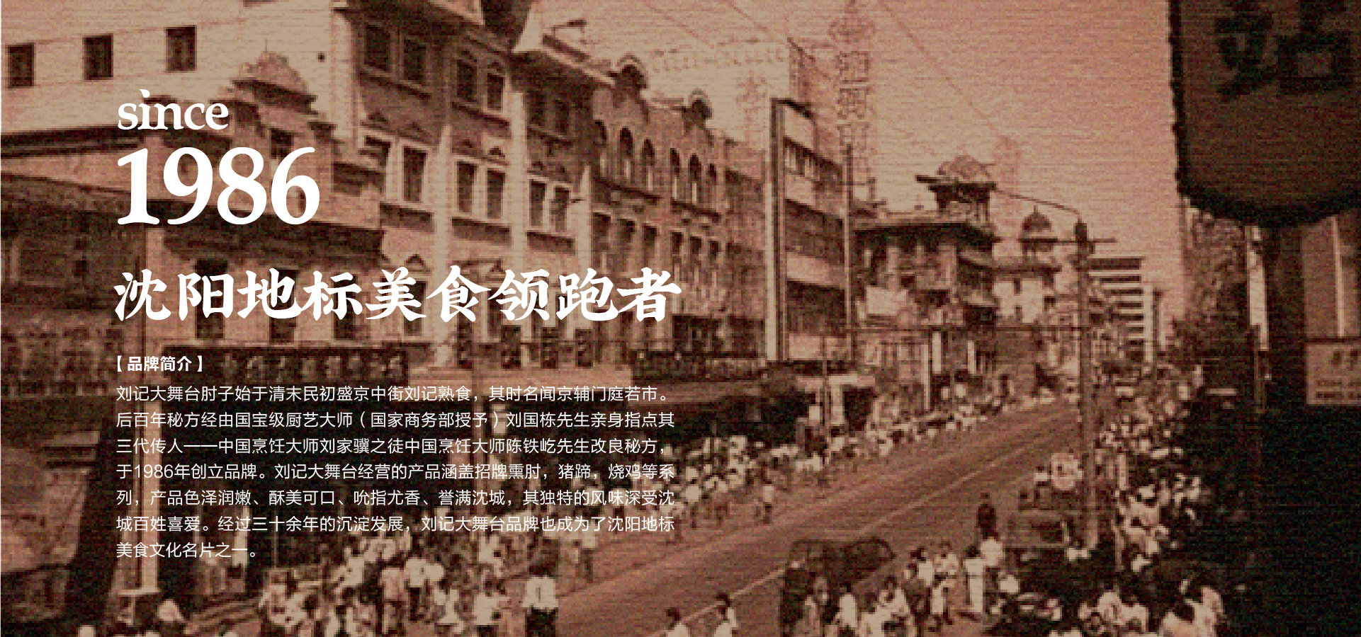 盛京,昔乃大清王朝發(fā)祥之地。劉記大舞臺(tái)肘子始于清末民初盛京中街劉記熟食,其時(shí)名聞京輔門庭若市。后百年秘方經(jīng)由國寶級(jí)廚藝大師(國家商務(wù)部授予)劉國棟先生親身指點(diǎn)其三代傳人——中國烹飪大師劉家驥之徒中國烹飪大師陳鐵屹先生改良秘方,于1986年創(chuàng)立品牌。劉記大舞臺(tái)經(jīng)營的產(chǎn)品涵蓋招牌熏肘,豬蹄,燒雞等系列,產(chǎn)品色澤潤嫩、酥美可口、吮指尤香、譽(yù)滿沈城,遂成古今絕味,其獨(dú)特的風(fēng)味深受沈城百姓喜愛。經(jīng)過三十余年的沉淀發(fā)展,劉記大舞臺(tái)品牌也成為了沈陽地標(biāo)美食文化名片之一。